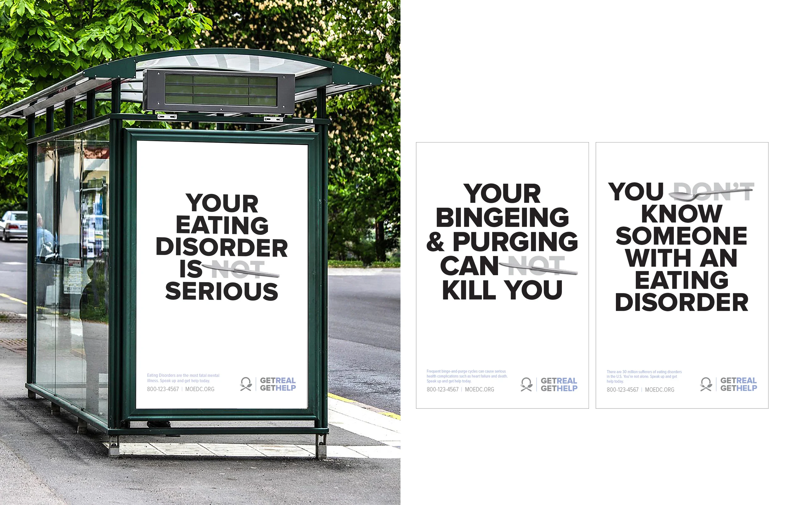 The headline strike-though changes the myth of each statement to read as a fact. These bold headlines break through the clutter and utensils quickly set the category of food. Placement of media focused on key areas to get this message in front of those at highest risk for eating disorders, such near universities and high-traffic highways. This effort was supported by engagement with local fashion bloggers and influencers to help spread the word in the digital space to connect individuals to the treatment options available, normalize the conversation and remove the associated stigma of seeking help.